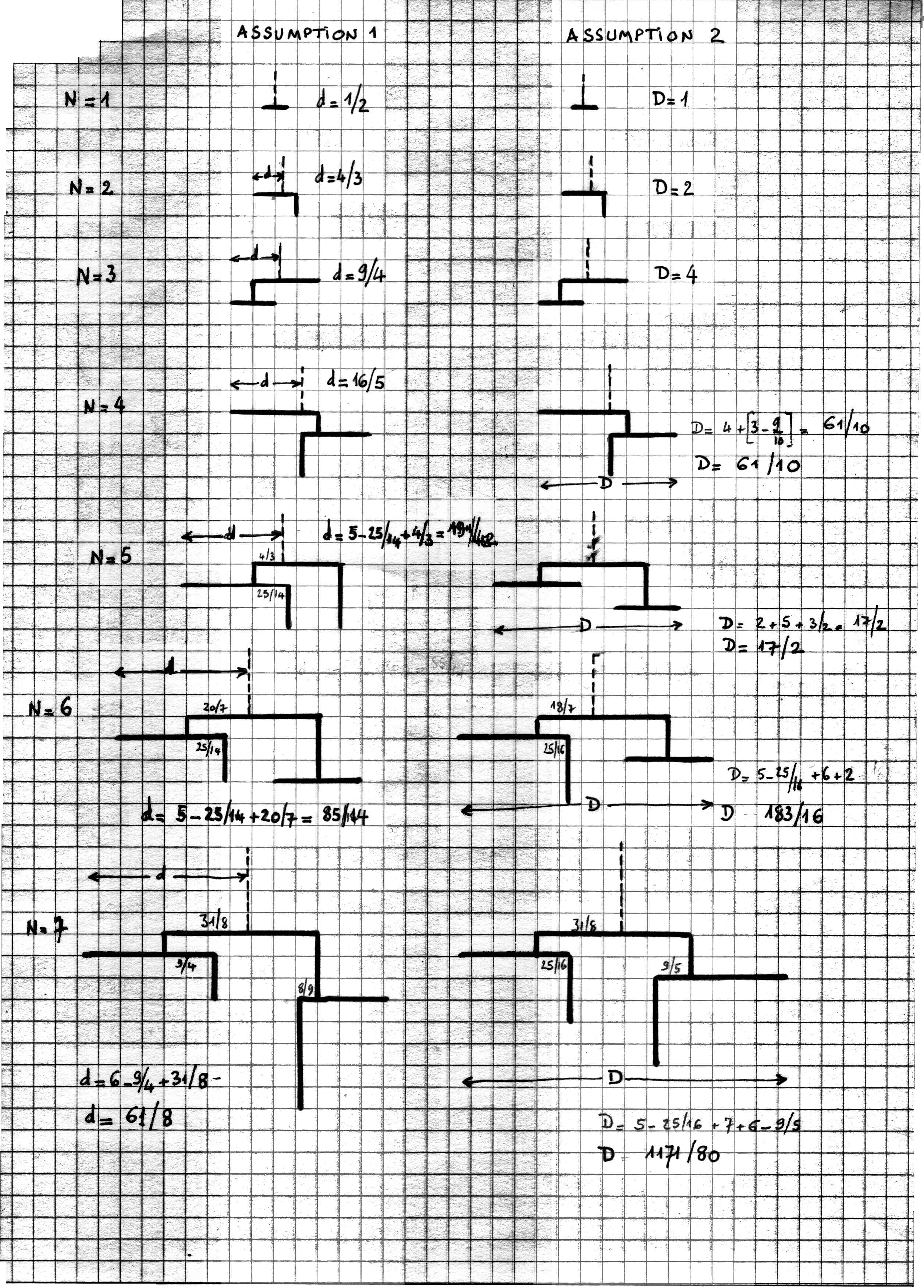Hereafter the distances that I have found according to the two cases: N case 1 case 2 1 1/2 1 2 4/3 2 3 9/4 4 4 16/5 61/10 5 191/42 17/2 6 85/14 183/16 7 61/8 1171/80 The attached JPG file 011003sol.jpg (750K) gives the corresponding diagrams. The scales of the rods have been respected.